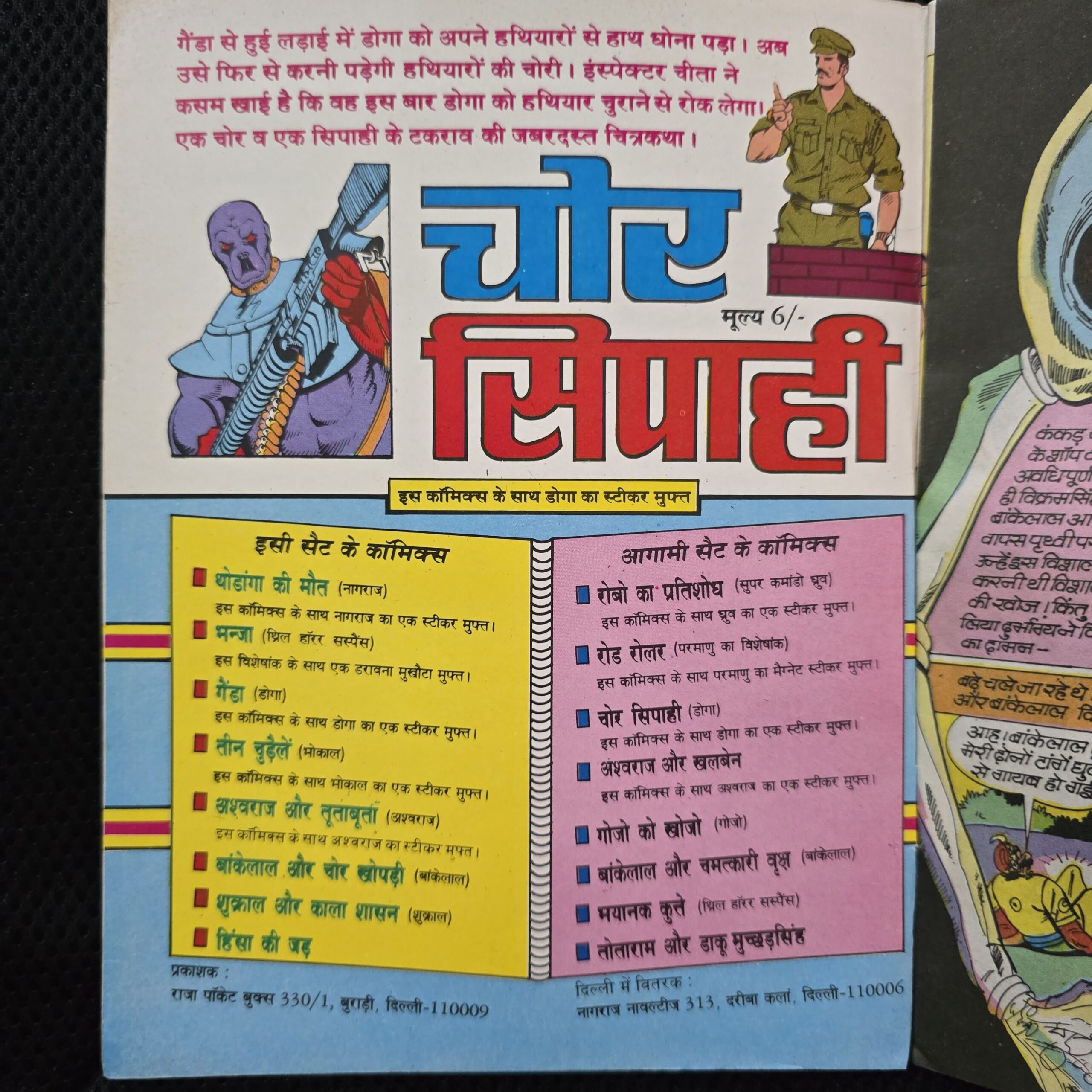 Back Cover: The back cover, featuring “चोर सिपाही” in large blue-red lettering alongside a table of contents listing various Bankelal stories, is intact and readable. Colour retention is good on the back cover.