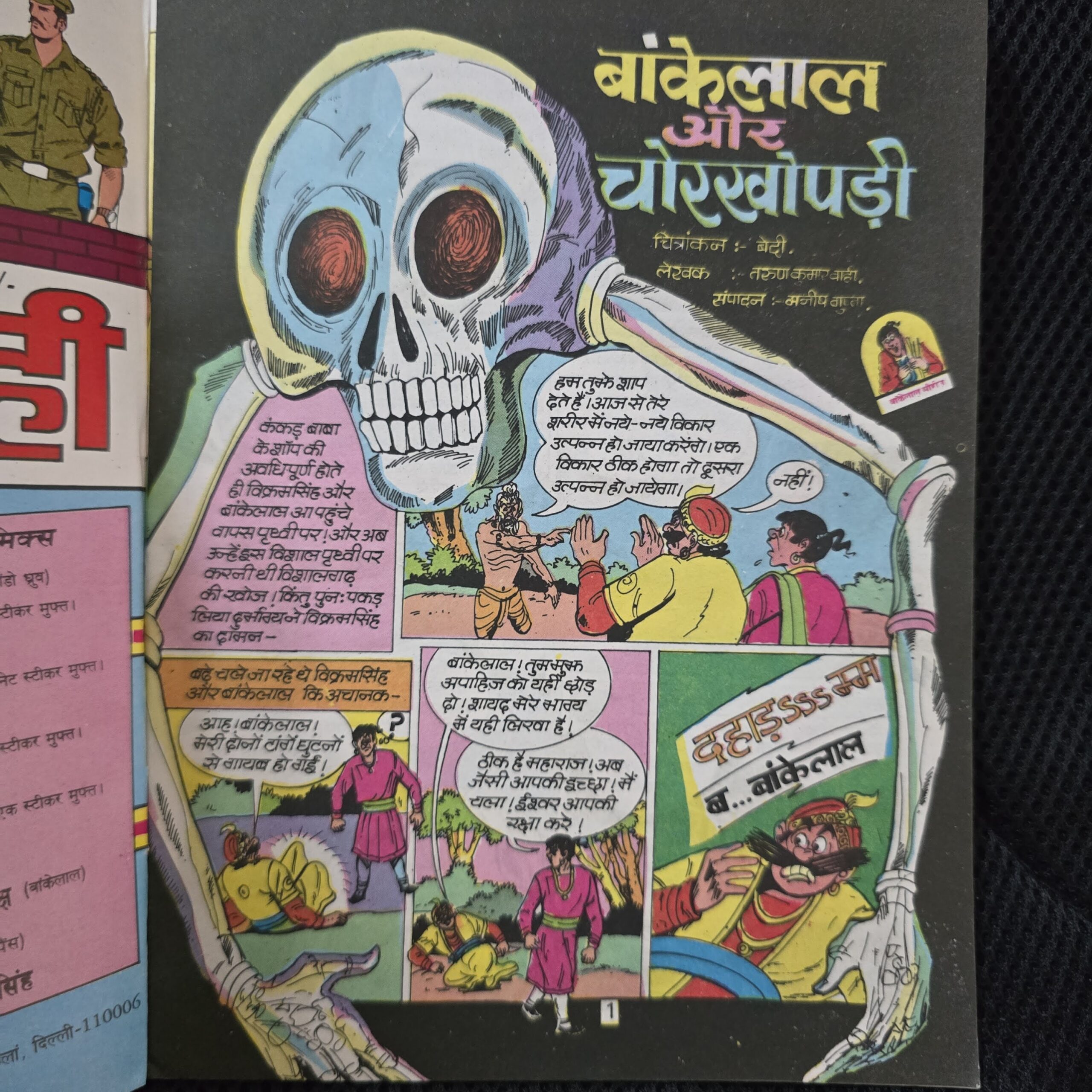 Bankelal is one of the most unique characters in all of Indian comics — a medieval court jester and self-styled schemer who constantly plots against his king, Vikram Singh, yet whose every plan backfires spectacularly, invariably ending up saving or helping the very person he was trying to destroy. Created by the legendary Jitendra Bedi (artist) and written through most of its run by the prolific Tarun Kumar Wahi[web:8], the Bankelal series blends slapstick comedy, medieval fantasy, and genuine horror-thriller elements into something entirely its own. In “Chor Khopdi” (The Thieving Skull), Bankelal finds himself entangled with a sinister skull — setting the stage for the kind of chaos, misadventure, and unintentional heroism that defines the character. The cover, dominated by a large menacing skull against the series’ signature vivid colour palette, says everything about what lies inside: danger, comedy, and Bankelal caught right in the middle of it all. The back cover features a bonus story — “Chor Sipahi” — adding additional value to this already memorable issue.